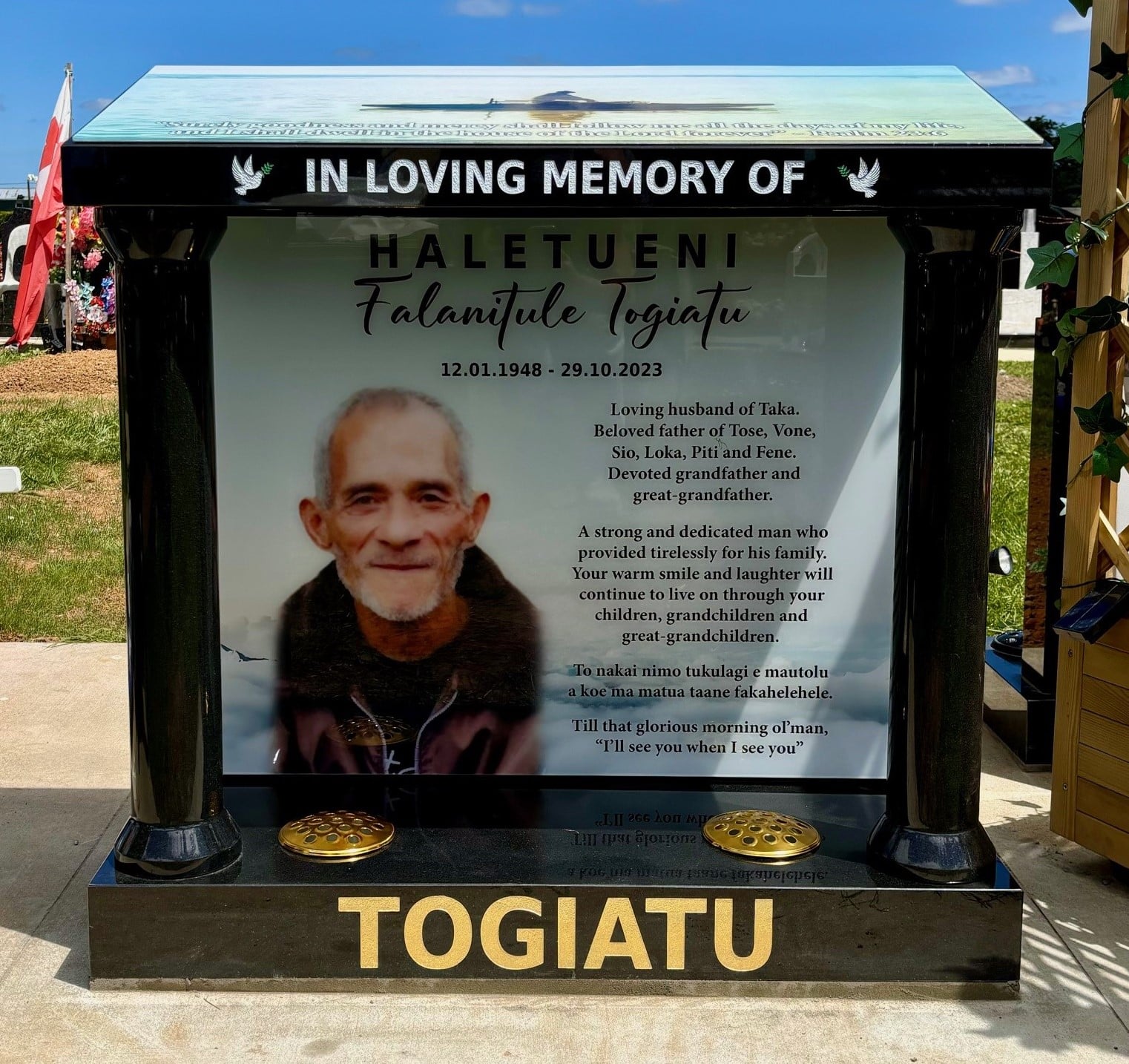 - Installation: scheduled once the cemetery site is prepared and approvals are complete